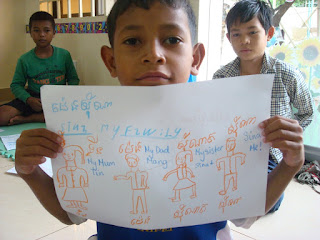 When we started planning the Summer Programme there was no question that arts and crafts were to play a big role in the daily activities. We tried to include at least two creative projects every day which were often related to our weekly themes and involved some useful vocab teaching. Even though I’m not great with artwork I got to take part in many of them because Srey Poch (my cheery Khmer partner and a lover of all arts-related activities) is talented, efficient, and patient enough for the two of us; and the kids found my occasional clumsiness more amusing than annoying. The summer camp began with simple activities like colouring in sheets, making balloon men, cutting out people’s shapes and drawing family portraits – all of which turned out to be really popular with the children, no matter how young or old. Where there were tools the kids were difficult to stop and even our two face painting sessions (causing an incredible level of excitement) ended in a sweet ‘chaos’ of kids with clown, tiger, butterfly and rainbow faces sitting in pairs all over the terrace, wildly drawing on each others’ arms and hands.