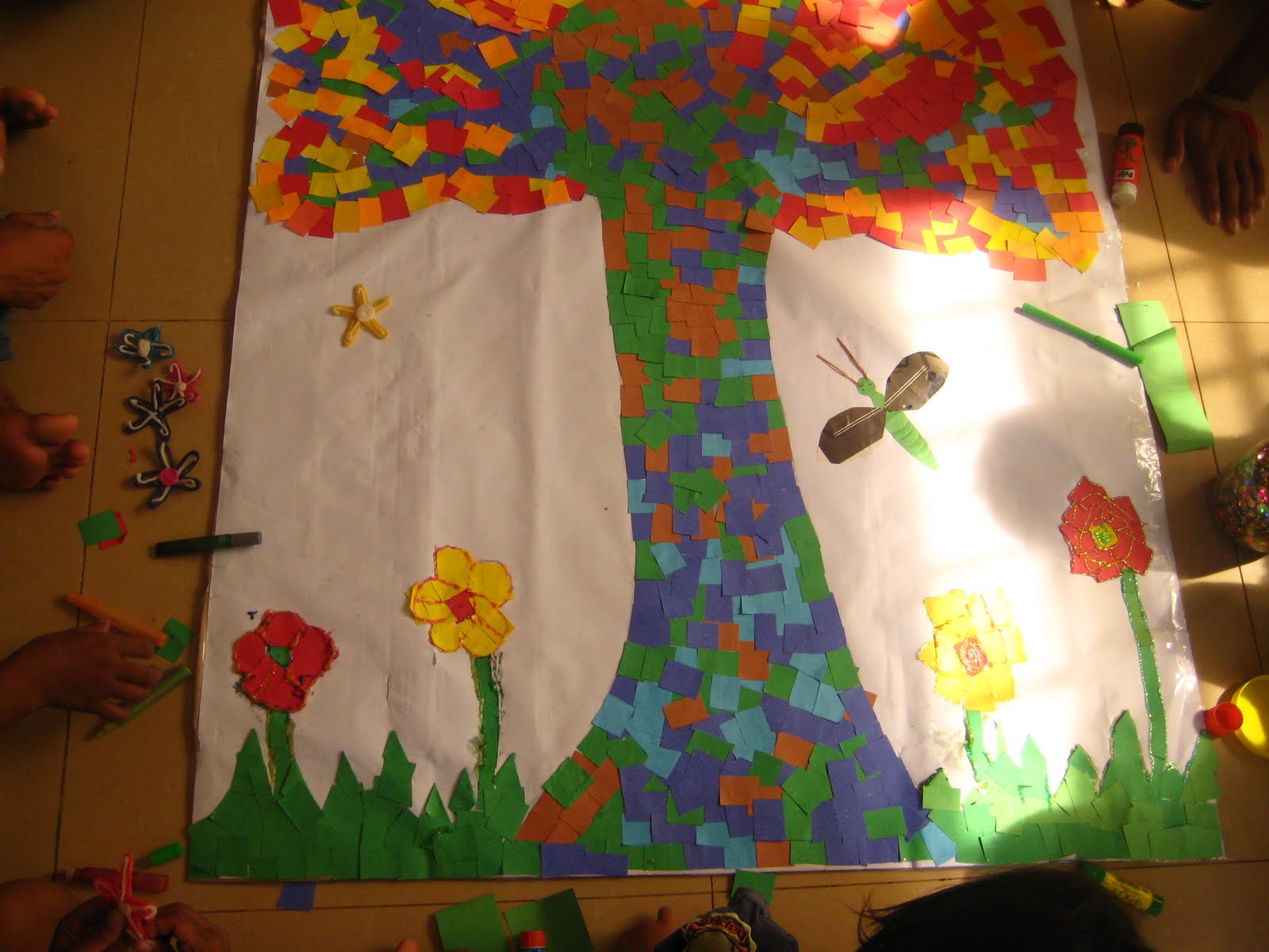 The kids loved being able to take home (or surprise a volunteer with) their own ‘masterpieces’ but I think what they enjoyed even more was working together on one big project: they enthusiastically embraced drawing a little boy’s body outline on a big piece of paper followed by colouring and labeling all its parts, watercolour painting a large jungle-inspired animal banner for the library, and – one of my personal favourites – creating a beautiful nature collage from bits of coloured carboard, felt, glitter, and glue.