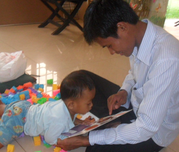 Once he is clean, Peng and Suphet spend time reading books together. Suphet is very inquisitive and Peng tries to teach him English vocabulary as well as reading him stories in Khmer.
