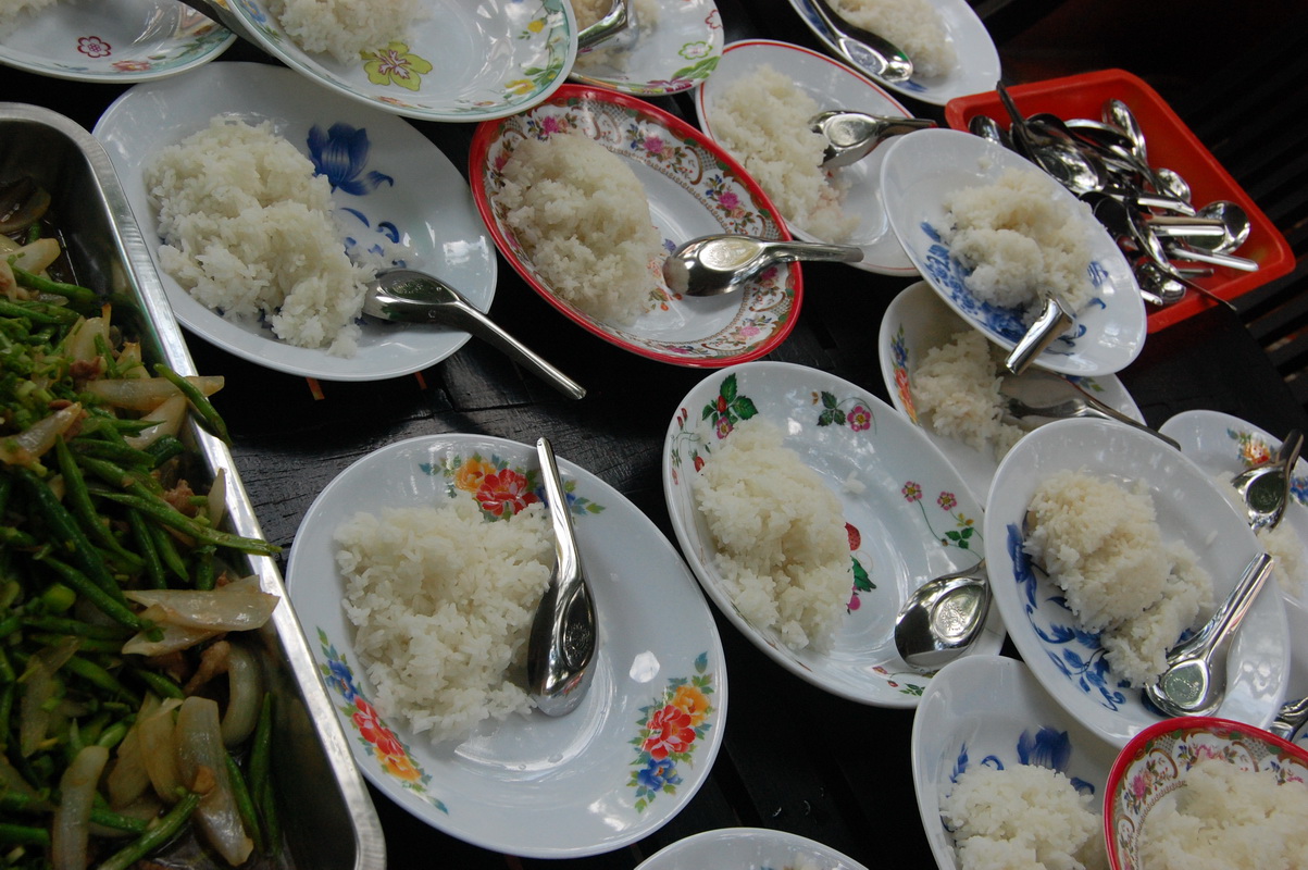 Getting ready for lunch. Every child receives rice,stir-fried vegetable with meat and a bowl of soup.
