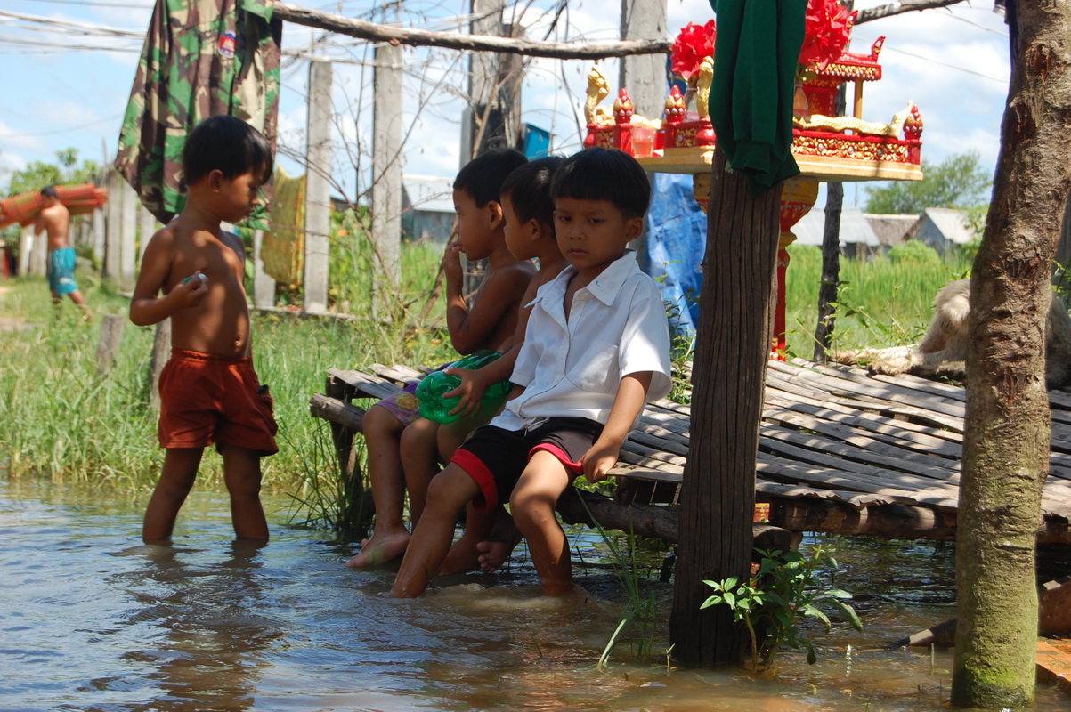 The day started early with the first children arriving at 7am. While Somath, our Librarian, provided fun and engaging activities in and outside the library Vantha, our Office Manager, and I (Nicola,Managing Director) headed into the squatters’ villages to advertise and importantly to check if there had been a change in the conditions. Our main concern was to check whether people had a dry place to sleep. Fortunately although levels had risen a little, the raised beds provided a refuge from the wet.