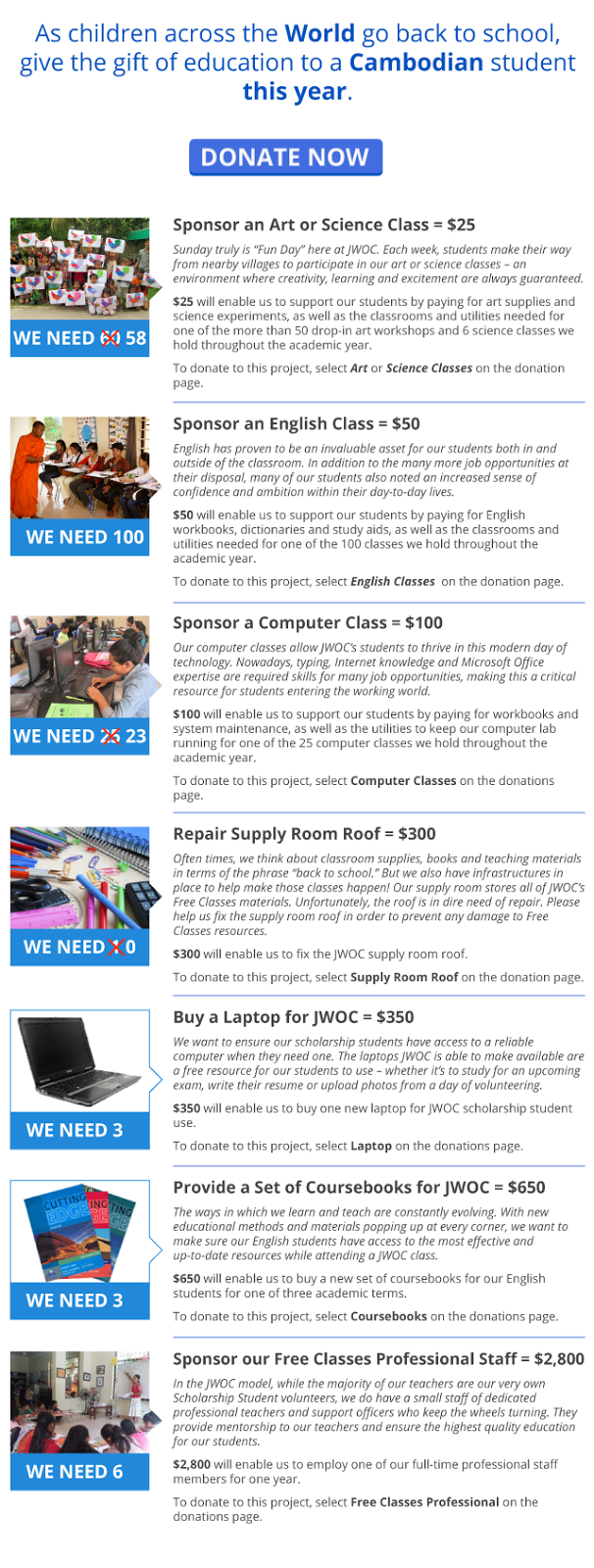 We’re so happy and lucky to have Eng Kea and the many other staff and scholarship students working within the Free Classes Program. They help our vision come to life. And as we enter this new academic year, we want to strengthen our collective impact on the students we teach and support a community so eager to learn. Your donation can make a huge difference in our students’ lives. Give the gift of education and support the students who attend JWOC’s Free Classes today!