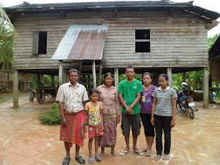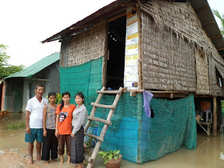 Chamroeun in Scholarship t-shirt and with her family outside their house, below